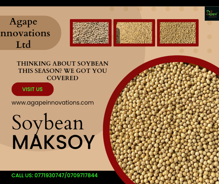 Agape Innovations Limited offers high-quality soybean seeds, Maksoy 6N and Maksoy 3N, ideal for Ugandan farmers. These varieties provide high yields, drought and disease resistance, and fast maturity. Suitable for various agroecological zones, they meet market demands for protein content. Certified seeds can be purchased from their Kampala office.