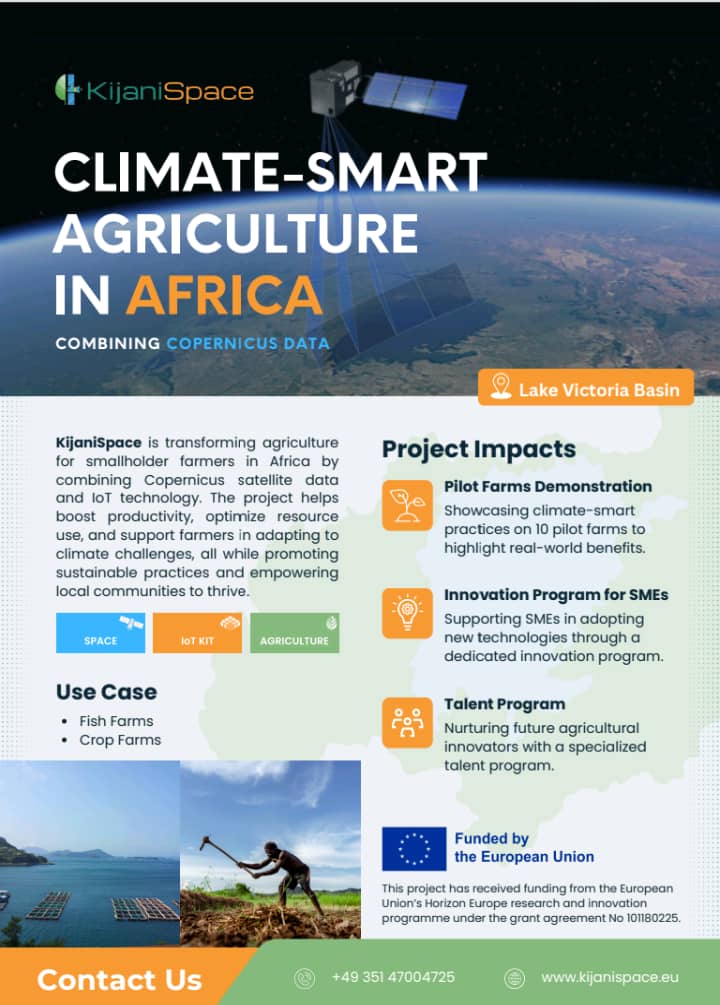 KijaniSpace integrates Copernicus Earth Observation (EO) satellite data with Internet of Things (IoT) technologies to empower smallholder farmers, ag-tech innovators, researchers, and communities with real-time, actionable insights that improve climate resilience and productivity for both crop and fish farming. Kijani Space